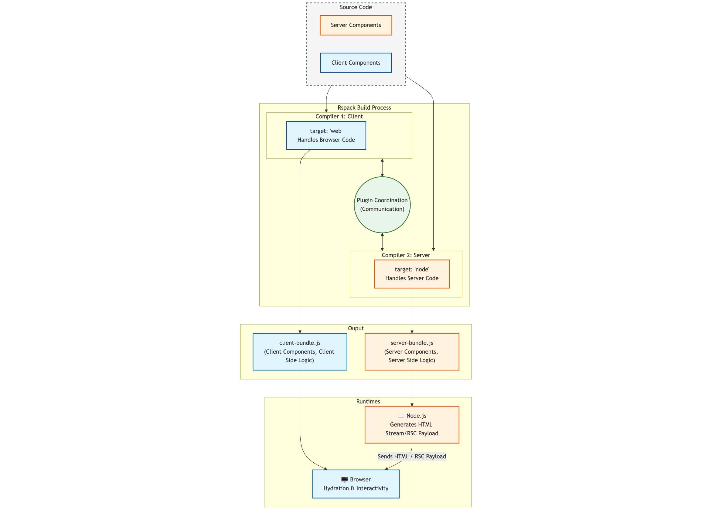 React Server Component artifacts require cooperative execution across both server and browser environments. To support this architecture, Rspack launches two Compiler instances to separately build the server and browser artifacts. The diagram below illustrates the overall build flow: