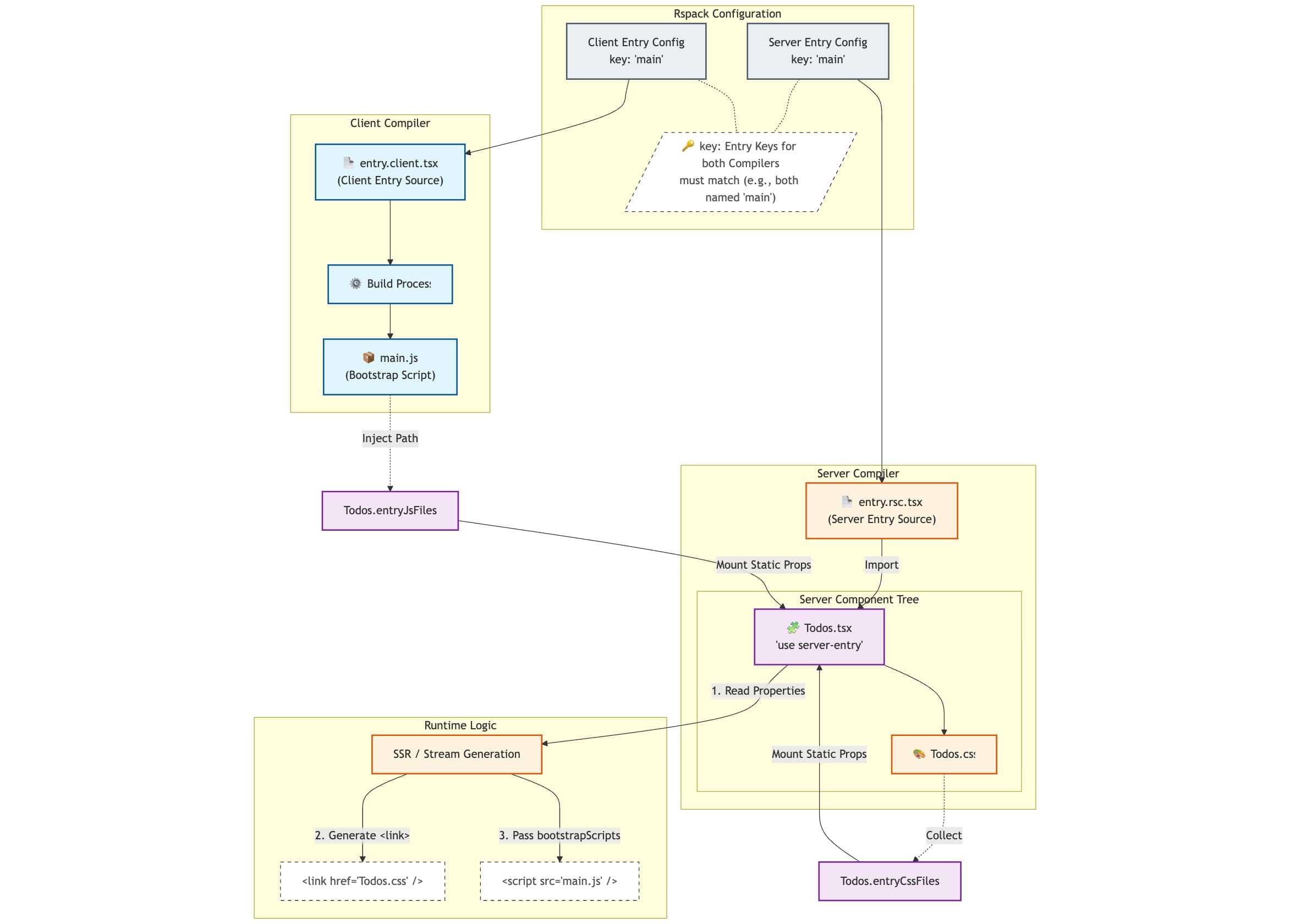 When compiling a component with "use server-entry", Rspack generates the complete set of resources required to initialize the RSC application in the browser and records this information by mounting static properties directly onto the exported component: